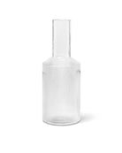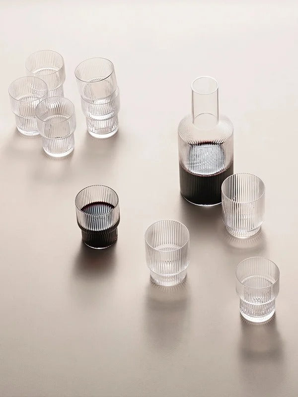 La caraffa Ripple è realizzata in vetro soffiato con una superficie caratterizzata dalla texture rigata che ha reso questo prodotto uno dei best seller di Ferm Living.