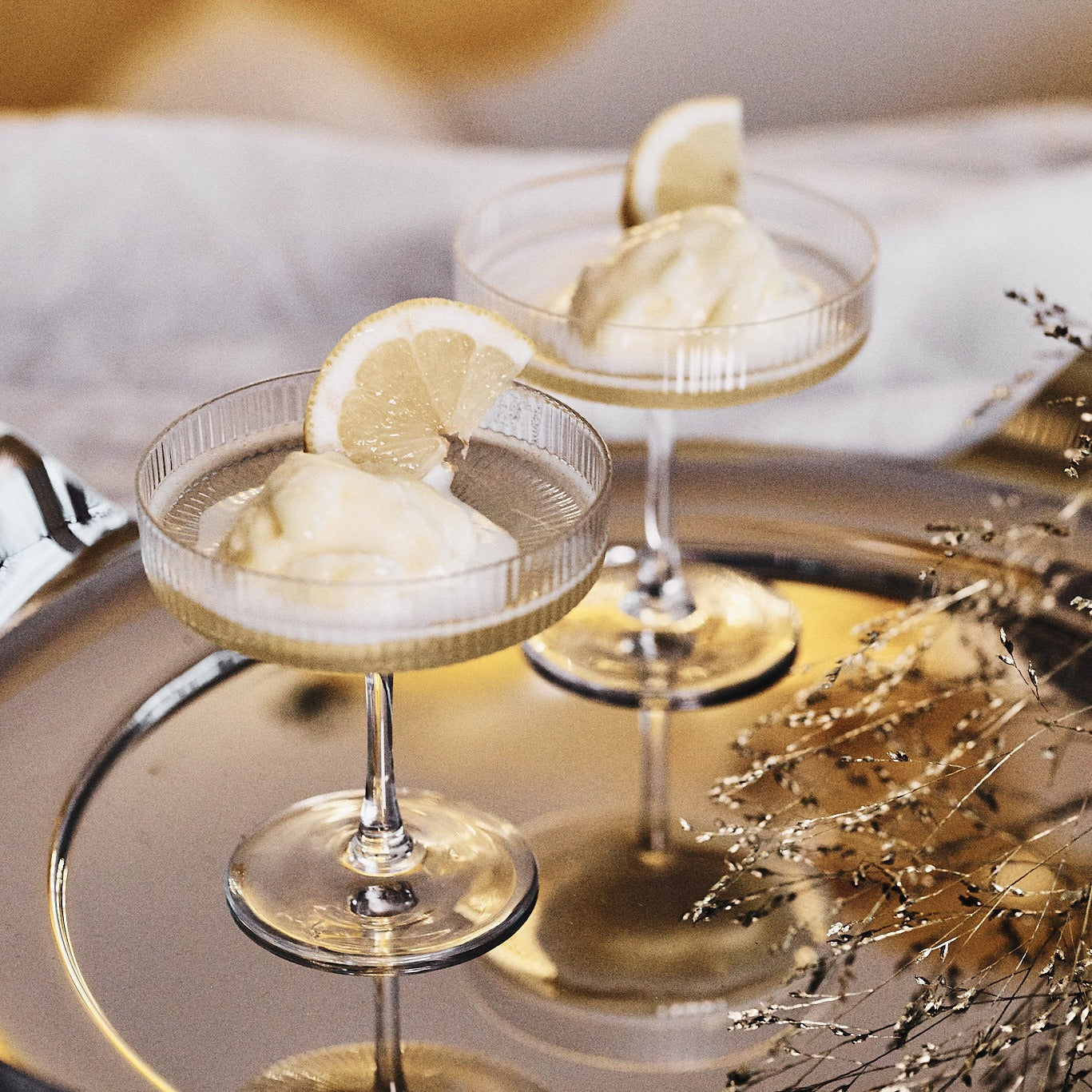 Ripple Champagne di Ferm Living è un set di 2 bicchieri in vetro soffiato zigrinati.