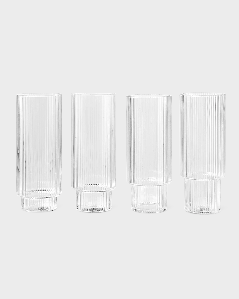 Ripple Glass di Ferm Living è un set di 4 bicchieri alti in vetro soffiato zigrinati.